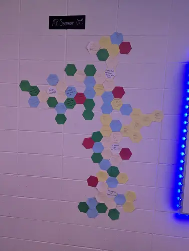 The colored paper has been helpful as the students differentiate between ideas, main claims, connected sources, evidence, and counter claims. Using the hexagonal method students were able to connect the stimulus material provided to them by collage board to create a beehive of information. At a glance students were able to identify major connections or logical fallacies in their arguments. This activity has helped them prepare for their final IWA paper for College Board.